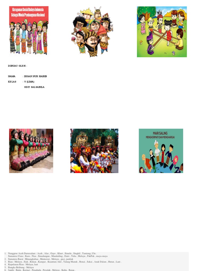 Indonesia merupakan Negara kesatuan yang penuh dengan keberagaman dan kekayaan. Indonesia terdiri atas beraneka ragam suku budaya ras daerah kepercayaan agama dan lain-lain. Mengamati berbagai gambar buklet.